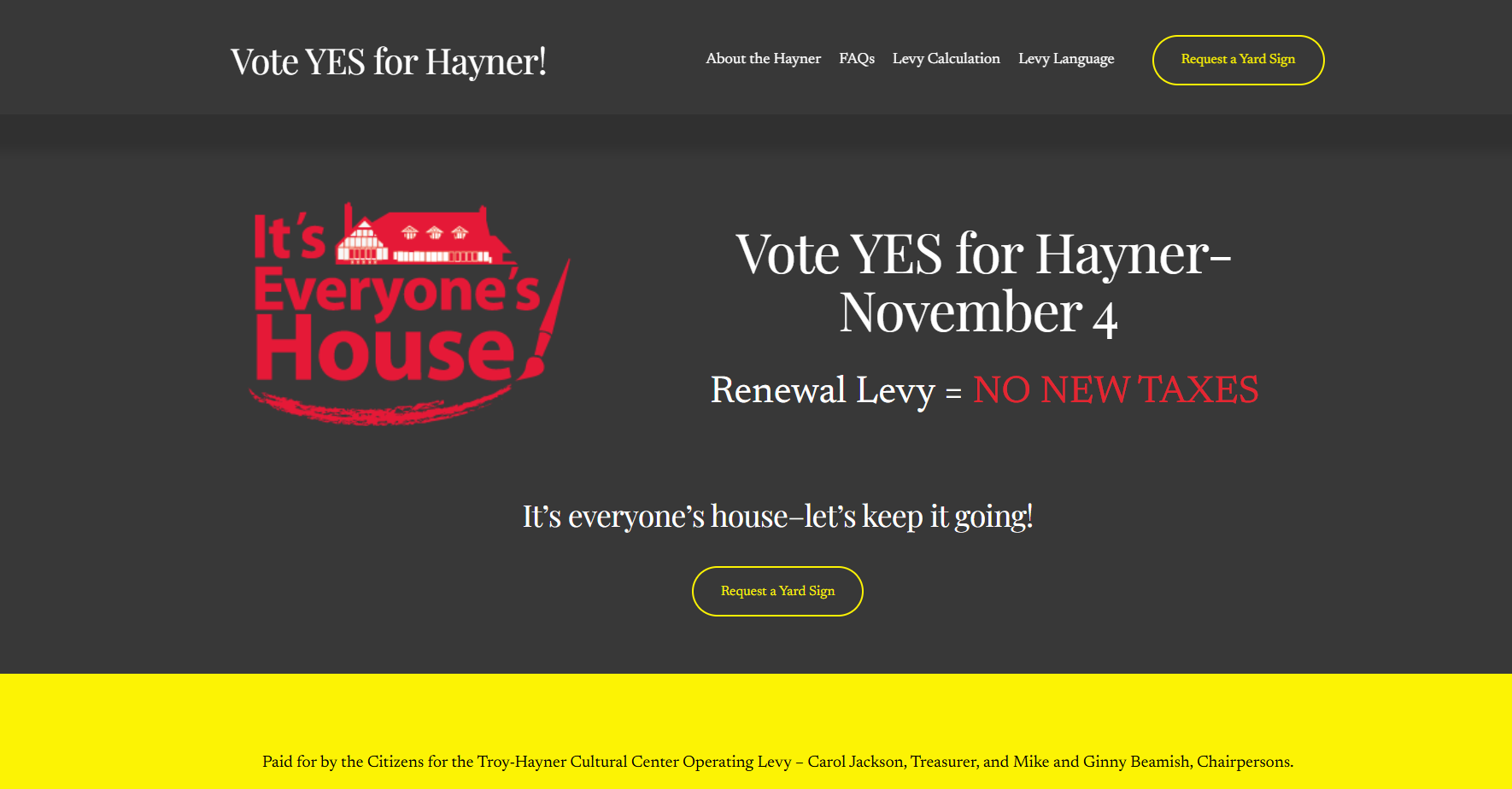 I created the online material and website for Citizens for the Troy-Hayner Cultural Center Operating Levy, which promotes a five-year renewal levy for a local cultural center. Tools used: Squarespace, Illustrator, Canva.